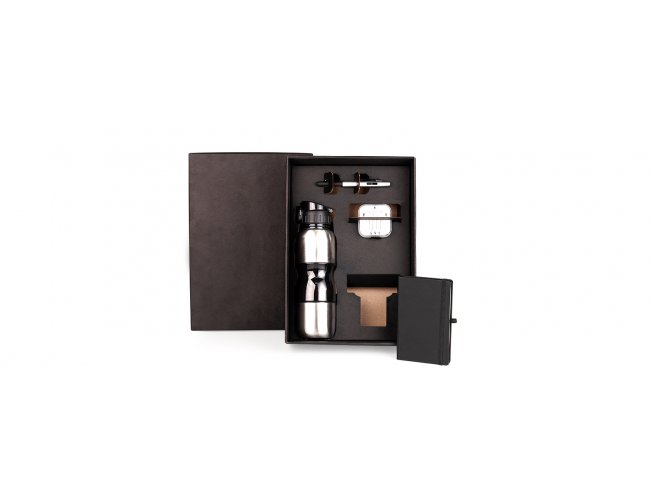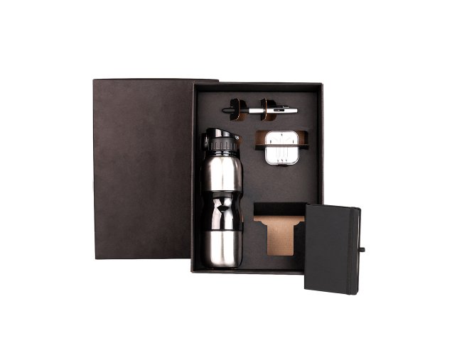 Conta com squeeze em aço inox; Caneta em plástico ABS prata; Caderno sem pauta; Fone de ouvido. Squeeze fumê revestido em aço inox 750ml. Acompanha copo rosqueável 200ml. Caneta com tampa e ponta touch.