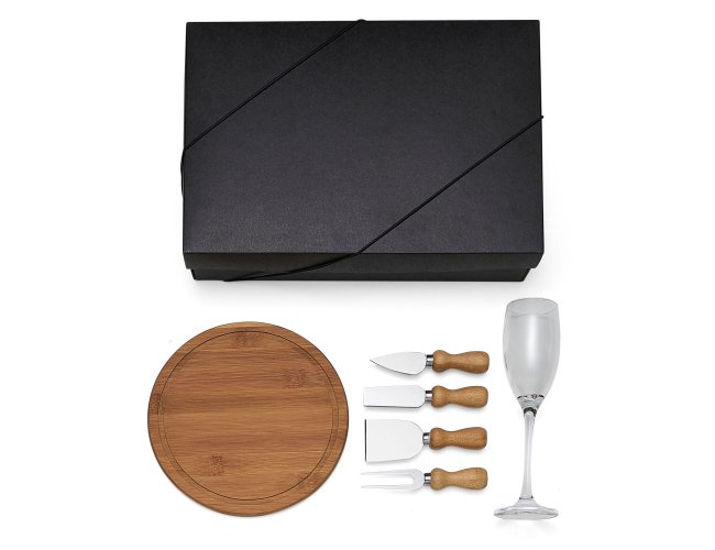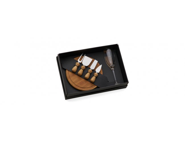 Conta com tábua em Bambu; Duas facas, uma espátula e um garfo para Queijo em madeira/inox; Taça em vidro.