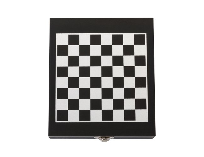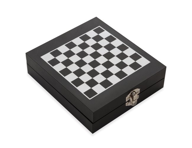 Kit vinho 4 peças em estojo tabuleiro de xadrez. Contém wine collar, tampa de bico, bico condutor com tampa e saca-rolhas metálico com lâmina de corte e abridor de garrafa. Estojo com trava de segurança e área interna com berço de espuma, acompanham 32 peças de xadrez e plaquinha metálica para personalização.