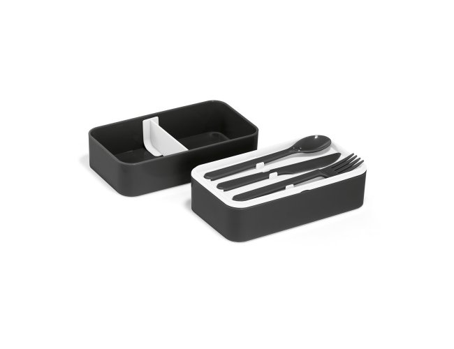 Marmita em PP e PS com 2 compartimentos (680 mL cada) e 1 divisória removível. Incluso 3 talheres: garfo, faca e colher. Fecha com banda elástica e está apta para micro-ondas, retirando a tampa. Certificação EU Food Grade.