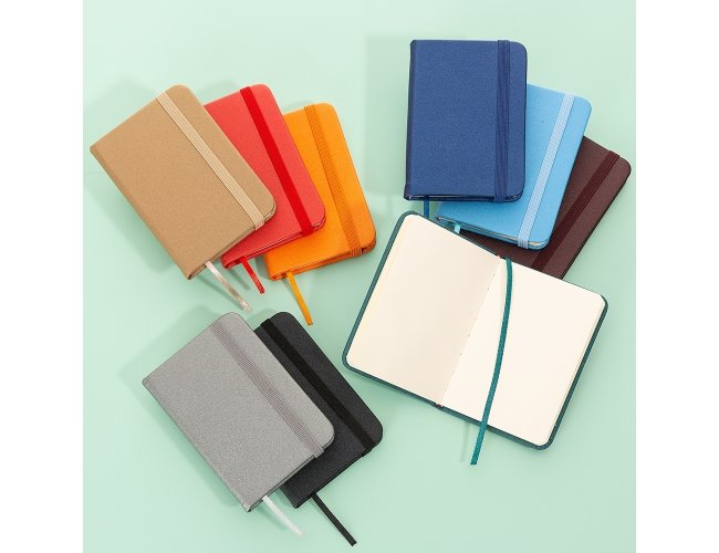 Mini Caderneta em material sintético brilhante com marcador de página em cetim e fita elástica para fechar. Contém aproximadamente 80 folhas amareladas sem pauta.