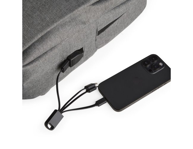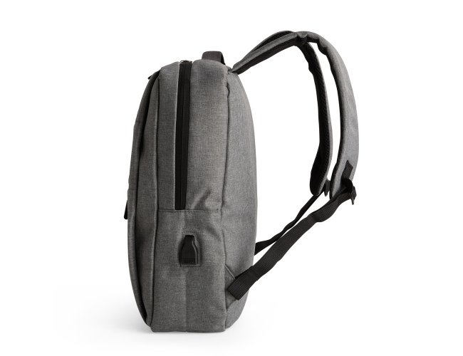 Mochila confeccionada em nylon Oxford impermeável, com fechamento em zíper, puxadores com detalhes em nylon e plástico e capacidade de até 14 litros. Possui compartimento interno principal com bolsos de tamanhos variados e divisória para notebooks de ate 15,6 polegadas. Possui três compartimentos externos, um deles com abertura lateral. Dispõe também de bolso lateral, porta USB, alça de mão em poliéster 210D e alças para as costas em tecido respirável.