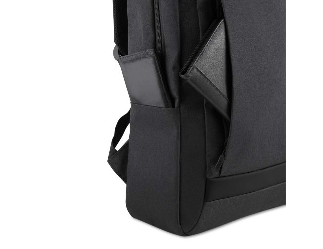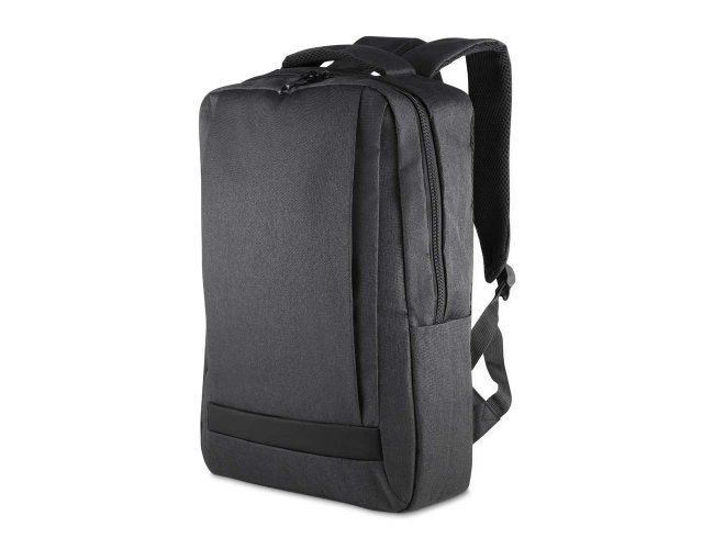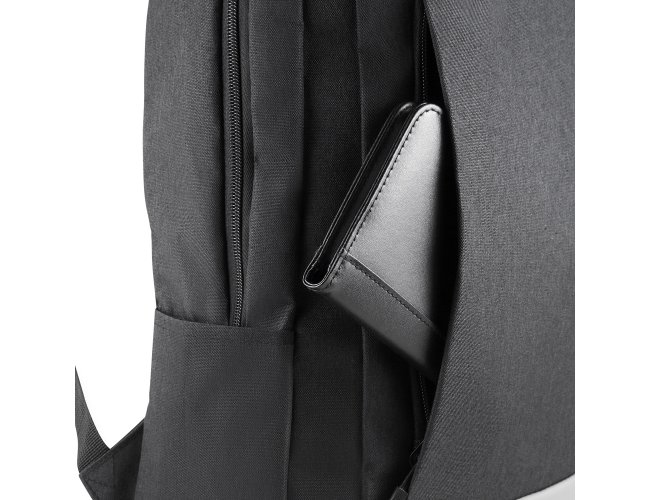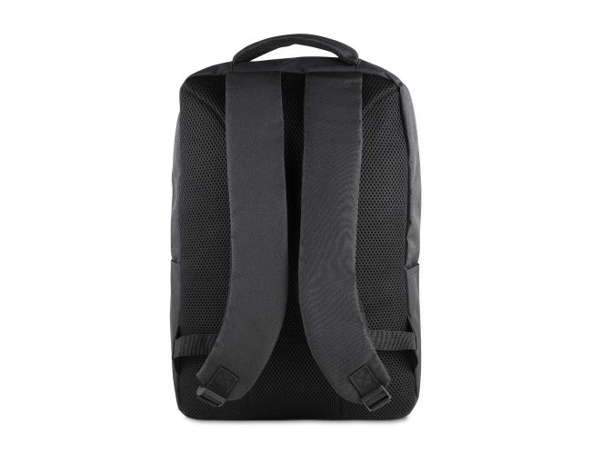 Mochila confeccionada em tecido externo de poliéster 300D com detalhe em PU e tecido interno em poliéster 210D, com capacidade total de 13,5 litros. Possui bolso frontal com fechamento em zíper, dois bolsos laterais e compartimento interno para notebook de até 15,6”.