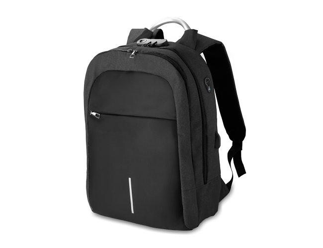 Mochila confeccionada em tecido externo de poliéster 300D e tecido interno em poliéster 210D. Possui fechamento em cadeado com segredo, bolso frontal com zíper, faixa reflexiva na parte frontal, saída USB e para fone de ouvido.