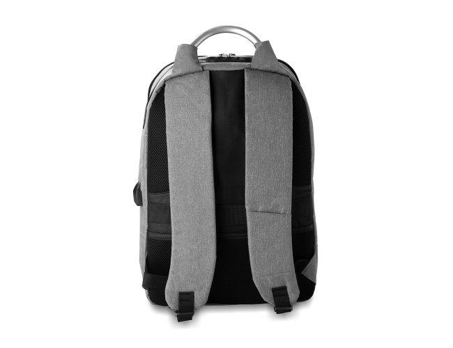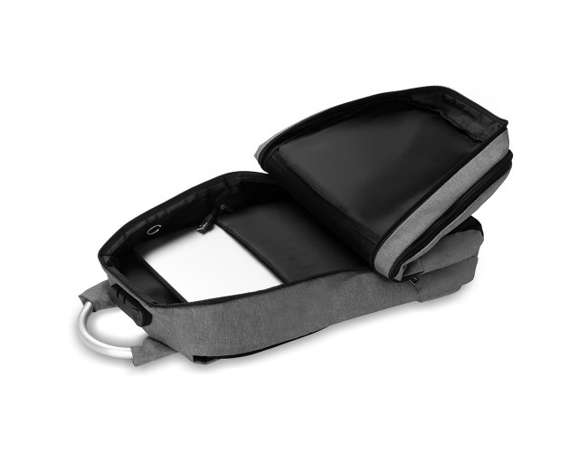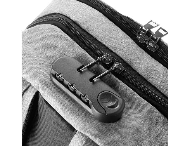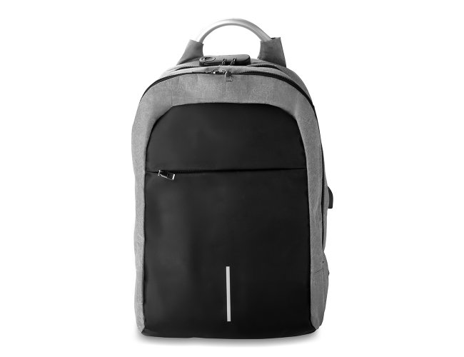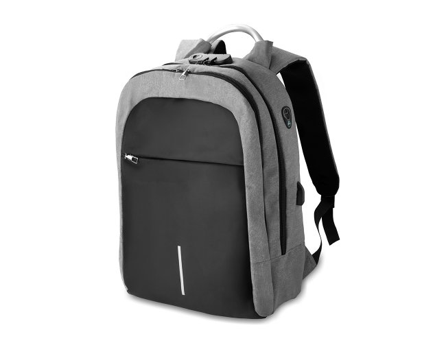 Mochila confeccionada em tecido externo de poliéster 300D e tecido interno em poliéster 210D. Possui fechamento em cadeado com segredo, bolso frontal com zíper, faixa reflexiva na parte frontal, saída USB e para fone de ouvido. Conta com alça de mão em metal, alça de ombro acolchoada, engate para mala de viagem e dois grandes compartimentos com fechamento em zíper, sendo um para pequenos