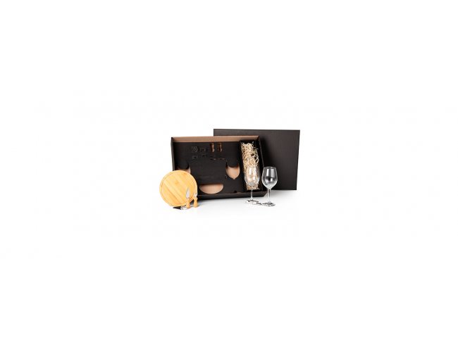 Kit para Queijo e Vinho. Conta com tábua para Queijo/Petiscos em Bambu; duas facas, sendo uma com ponta e outra reta, garfo e espátula em Madeira/Inox; duas taças para vinho em vidro; abridor e tampão em Metal; espaço para garrafa com palha (NÃO ACOMPANHA GARRAFA). Estão perfeitamente acomodados em uma caixa para presentear.