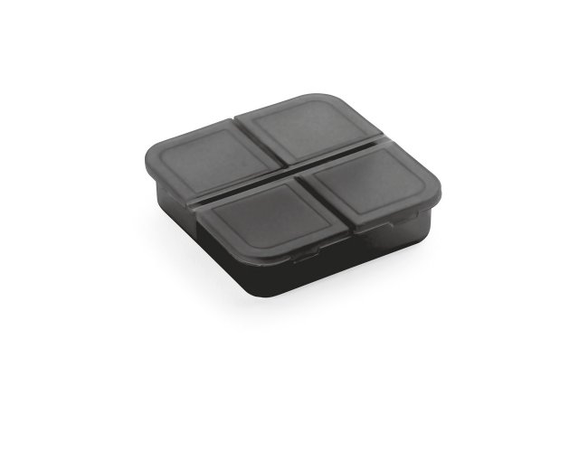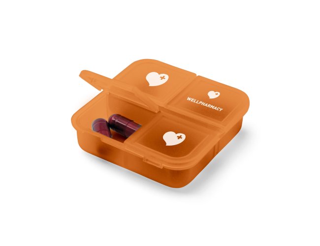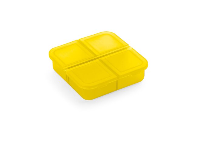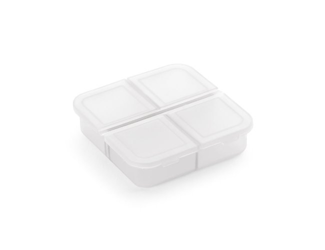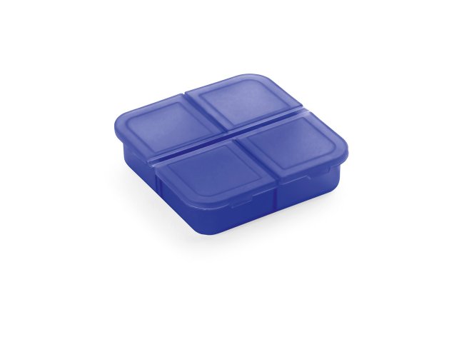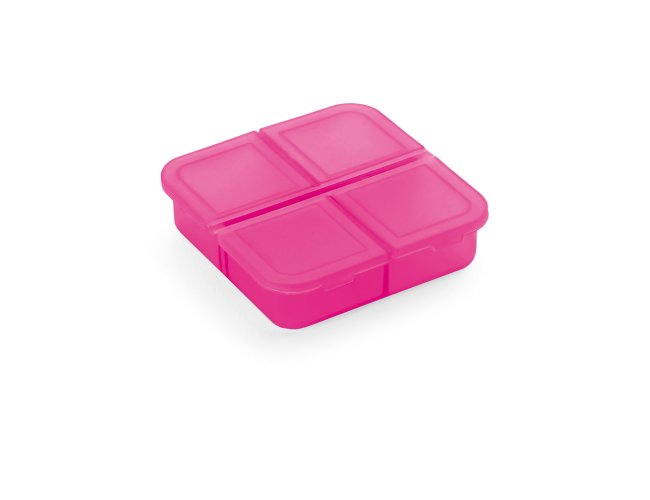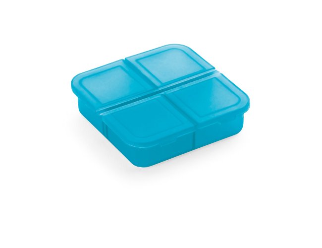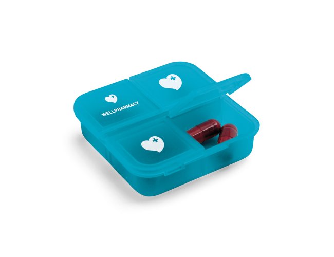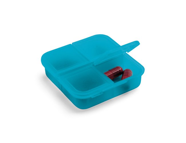 Porta comprimidos com 4 divisórias com tampa, disponível em várias cores. Food grade. 60 x 60 x 18 mm