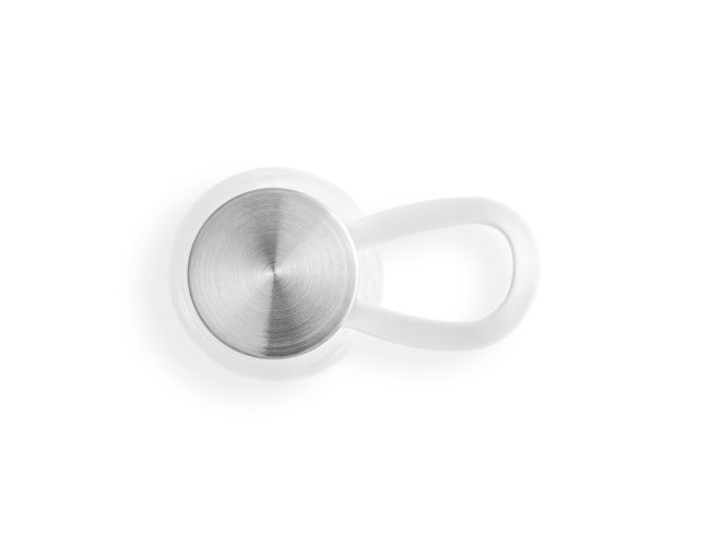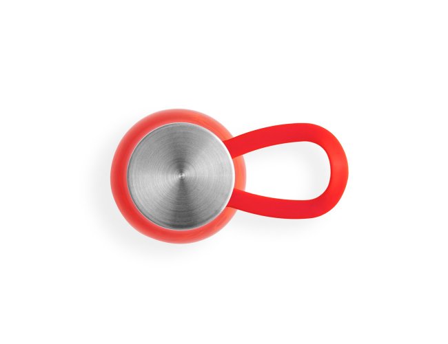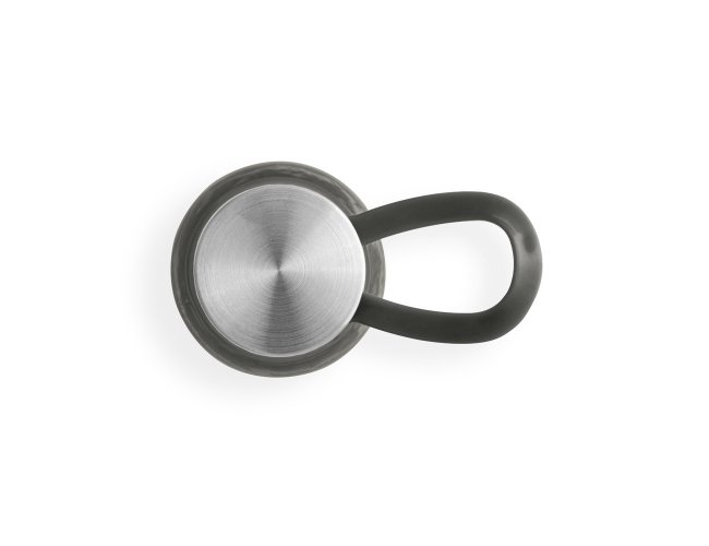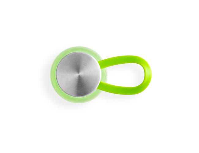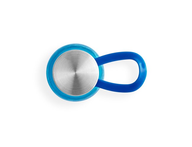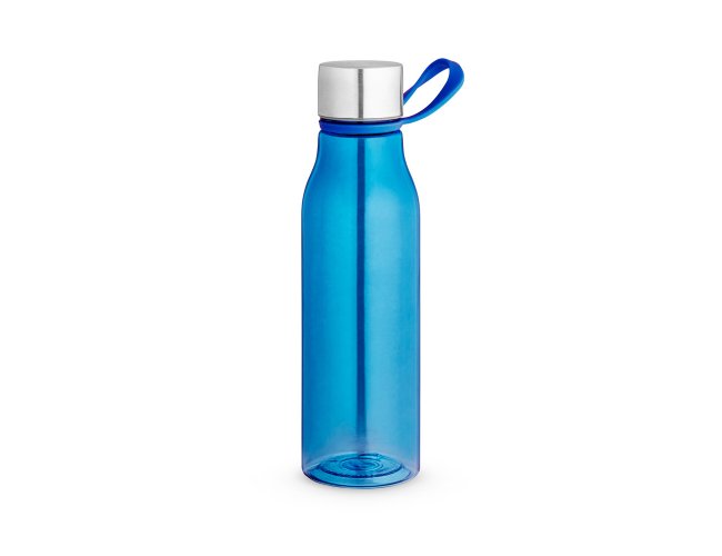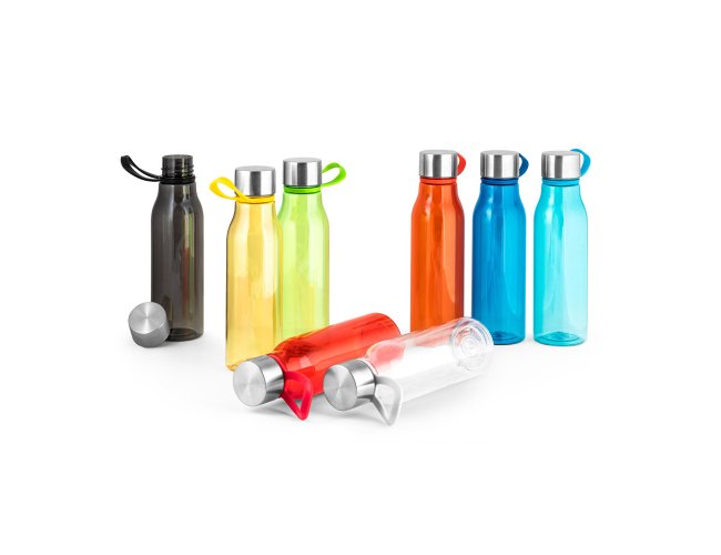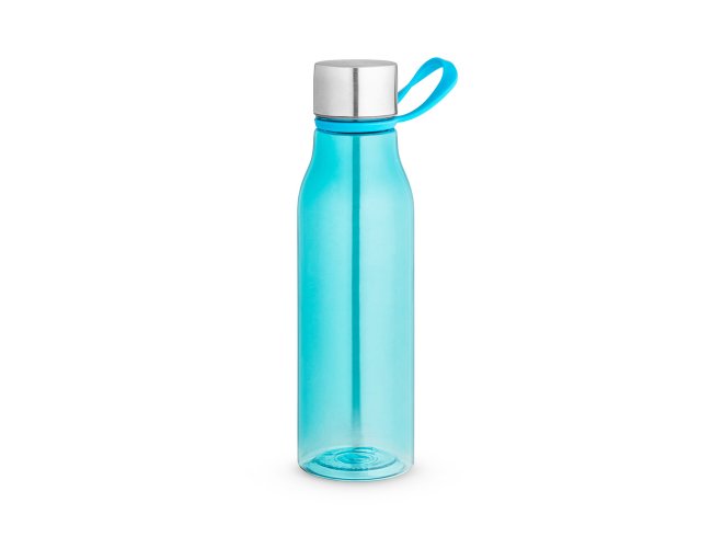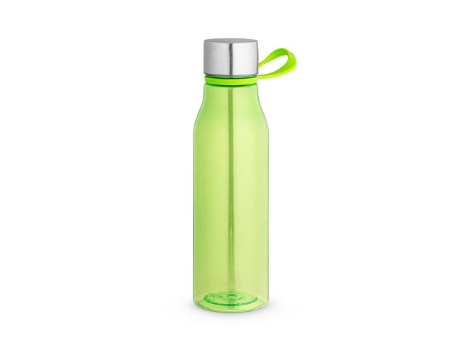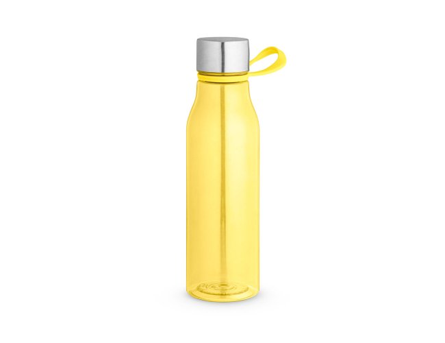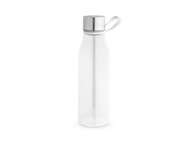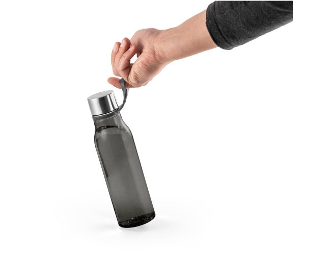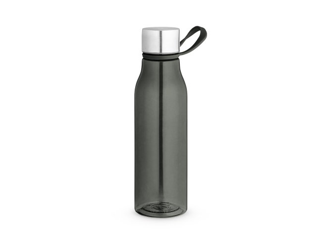 Squeeze produzido a partir de plástico reciclado, rPET. Com alça de silicone para facilitar o transporte. Tampa em PP e aço inox com isolante em silicone. Capacidade até 590 ml.